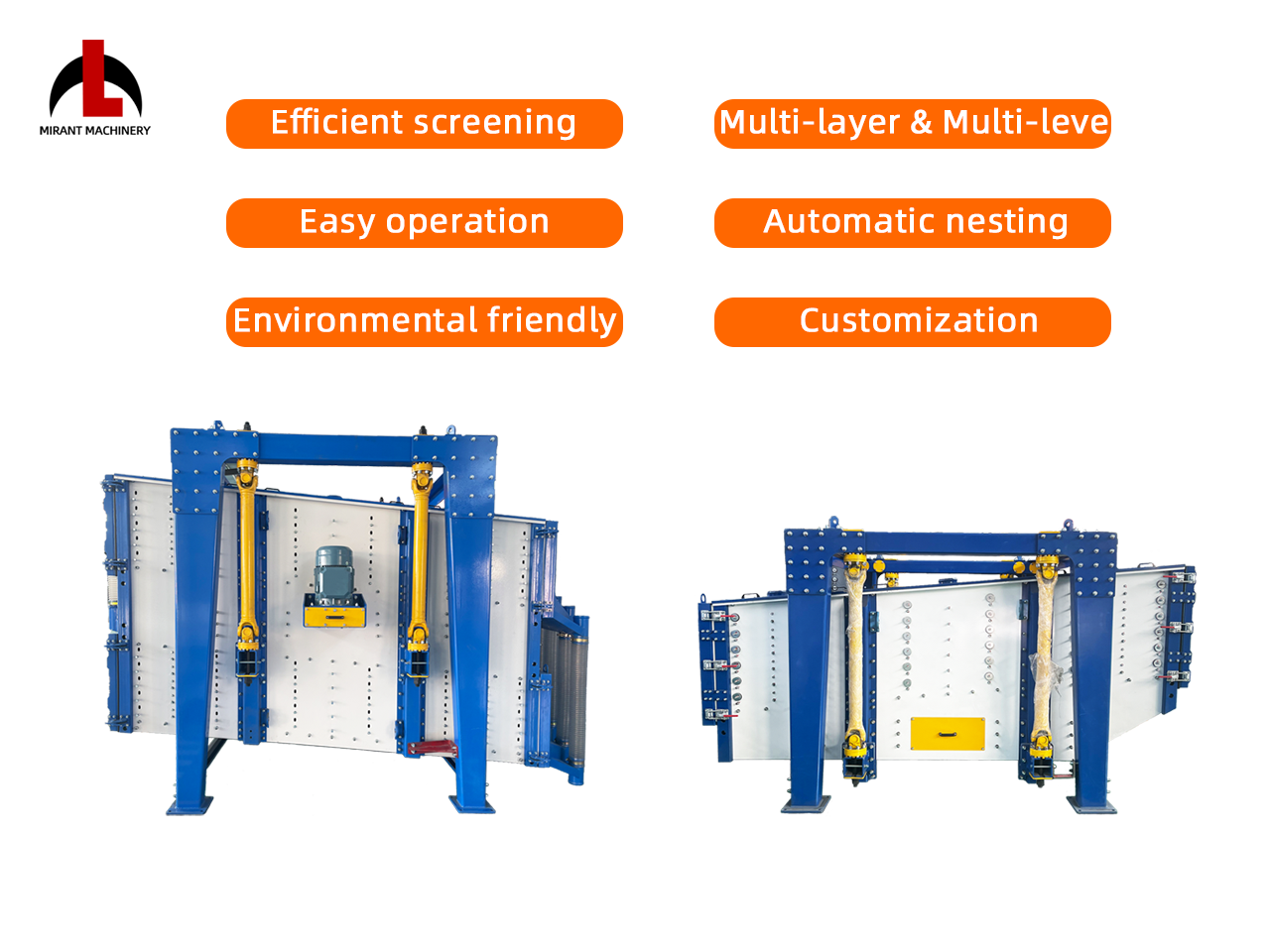 Mirant Gyratory Sifter simulates the motion of human hands sieving, combining "sieve" motion (planar circular motion) and "dustpan" motion (throwing materials upwards), which can quickly spread the material across the full width of screen at the feed end and drive the particles moving forward to touch the screen surface with high capacity and high efficiency.
